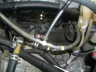 フュエルレギュレターとサージタンクの間から取るのが一般のようです。ただ 後になって分かったのですが、ここから取ると負圧が出にくいらしいです。 流石に切断する時は緊張しました(笑)ここに三又(オリフィス付き)を使って 分岐します。しっかり差し込んだらホースクリックを使って固定します。 車内への引き込みは、ウーハーの時と同じグロメットを使用しています。 引き込む時に、ホースの「ねじれ」や「つぶれ」に注意しましょう。 |